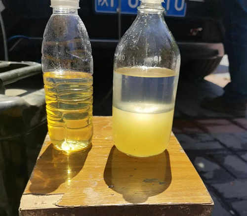 正常汽油(左)与涉事加油站汽油(右)对比。图片来源:极目新闻