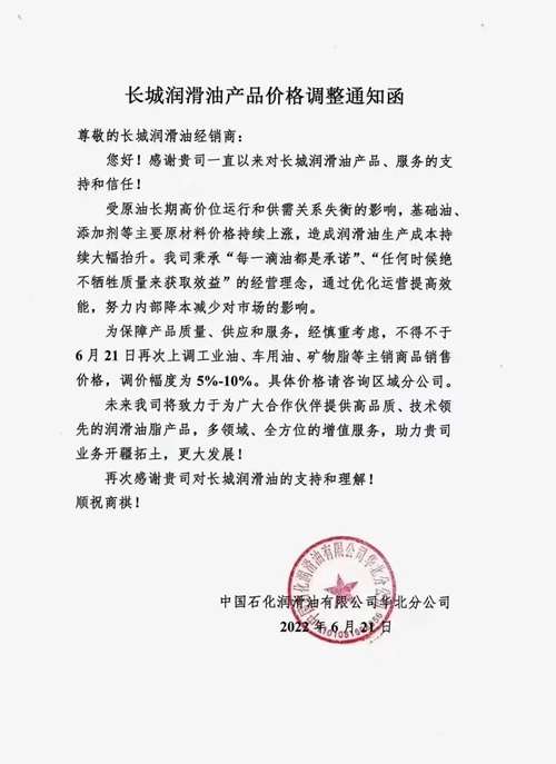 近期,壳牌、美孚、GS、昆仑、长城等多家润滑油企业发布价格调整通知:
