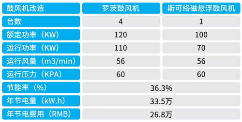 山东地区某热电厂采用斯可络磁悬浮离心鼓风机替换原有罗茨鼓风机除去烟气中的二氧化硫。节能效果显著,节能率达36.3%,预计年节电量33.5万kW•h,年节约电费26.8万元。根据1度(kW•h)电折算为二氧化碳排放量为0.96kg,预计减少二氧化碳排放量约为32.2万吨。
