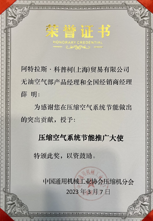 2023年3月7日,中国通用机械工业协会于第十一届中国(上海)国际流体机械展览会,举办了隆重的颁奖庆典中国通用机械工业协会会长黄骊女士为十大博彩公司娱乐颁发“压缩空气系统节能突出贡献单位” 以及无油空气部员工薛明先生“压缩空气系统节能推广大使”个人荣誉称号。