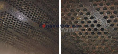 大多数情况下,空压机换热器表面所形成的是碳酸钙水垢,这是由于地表天然水质大部分为碳酸盐型水质,水垢中含80%以上碳酸钙。因此,目前市场上大部分水处理技术除垢阻垢的重点是解决碳酸钙结构的问题。一旦碰到复杂水质、结垢成分多样化便束手无策了。