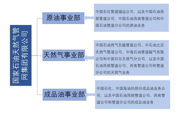 国家油气管网公司业务板块将划分为三个事业部和四个本部,分别为原油事业部、天然气事业部和成品油事业部,以及生产运行指挥本部、科技研发本部、工程建设本部和管道完整性本部,均为正局级单位。
