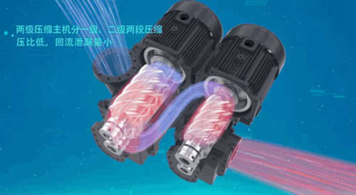 分级压缩,压比自适应当前使用压力,回流泄漏量减小,提高能效
