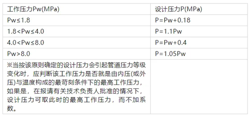 管道的设计压力:应不低于正常操作时,由内压(或外压)与温度构成的最苛刻条件下的压力。