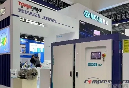 通润·牧风展示了无油水润滑双螺杆变频压缩机整机和螺杆主机,整机布置工整、配置讲究,不锈钢双螺杆主机、分离罐、进气阀、最小压力阀及管路格外耀眼。