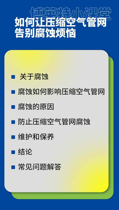 压缩空气系统中的腐蚀主要是由于接触水,这会引入氢气和氧气。尽管有保护涂层和处理措施,水仍然可能进入系统,因此,减少冷凝水是防止腐蚀的关键。