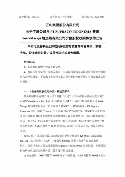 开山股份(300257.SZ)公告称,公司下属公司OTP Geothermal Pte., Ltd.和KS Orka Renewable s Pte. Ltd.与PT Supraco Indonesia签署《有条件股权收购协议》,合计以300万美元现金收购Supraco持有的SMGP股份。交易完成后,OTP和KSO将分别持有SMGP 98.57%和1.43%的股份,公司将持有SMGP 100%的股份。