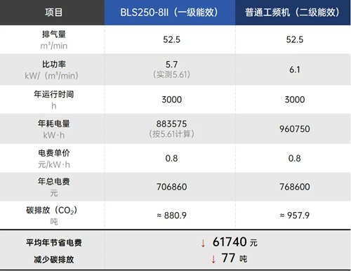 该产品采用 工频驱动结构+高效水冷系统+双级压缩技术 组合方案,在煤矿行业的生产场景中表现出良好节能特性,实测工况下比功率为5.61kW/(m³/min),超出国家一级能效指标1.58%。