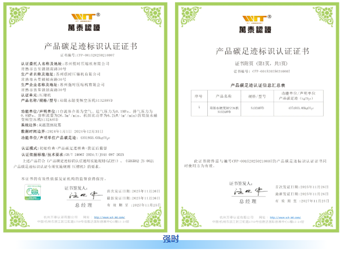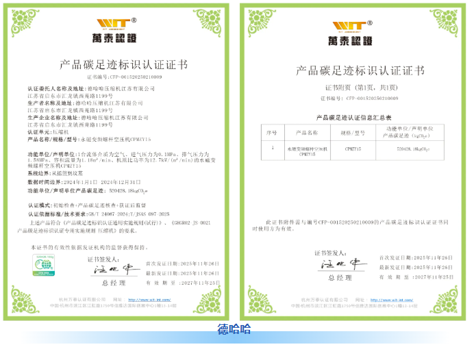 德哈哈压缩机江苏有限公司同样凭借在低碳技术研发、生产流程优化、能源高效利用等方面的持续投入,其核心产品顺利通过碳足迹核查,展现了与苏州强时并肩引领行业绿色发展的强劲实力。两家企业的认证通过,不仅验证了其产品在全生命周期内的环境友好性,更体现了企业主动承担碳减排责任、践行绿色发展理念的坚定决心。