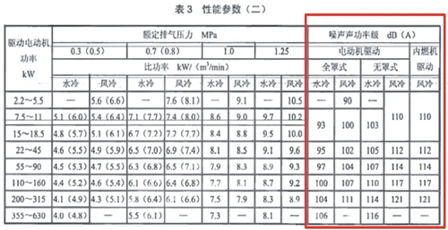 JB/T 6430《一般用喷油螺杆空气压缩机》规定:螺杆空压机在规定工况下,噪音声功率级应不大于下表规定。