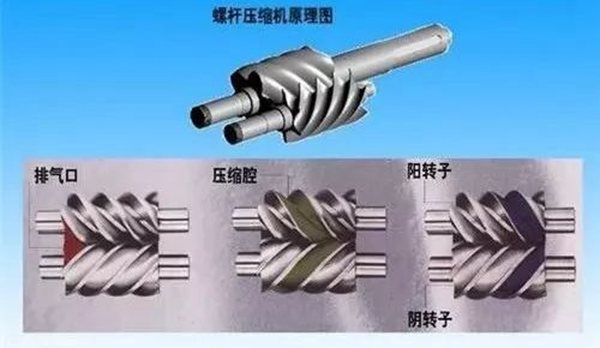 螺杆式空气压缩机的工作容积是由一对相互平行放置且相互啮合的转子的齿槽与包容这一对转子的机壳所组成。在机器运转时二转子的齿互相插入对方齿槽,且随着转子的旋转插入对方齿槽的齿向排气端移动,使被对方齿所封闭的容积逐步缩小,压力逐渐提高,直至达到所要求的压力时,此齿槽方与排气口相通,实现了排气。