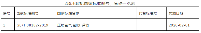 2019年第3号、第13号中国国家标准公告,由国家市场监督管理总局、国家标准化管理委员会批准发布了2项压缩机专业国家标准。于2020年实施的标准具体名称、编号及实施日期如下: