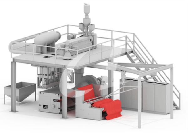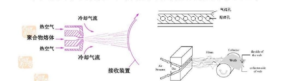 熔喷布的生产工艺便是熔喷非织造工艺,利用高速热空气对模头喷丝孔挤出的聚合物熔体细流进行牵伸,由此形成超细纤维并凝聚在凝网帘或滚筒上,并依靠自身粘合而成为非织造布。