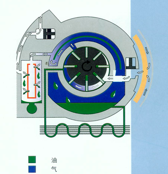 转子在气缸的定子中旋转,在旋转期间,离心力将滑片从槽中甩出,形成一个个单独的压缩室,旋转使压缩室的体积不断减小,空气压力不断增大,通过注入加压油来控制压缩产生的热量, 进而就完成了对空气的压缩。