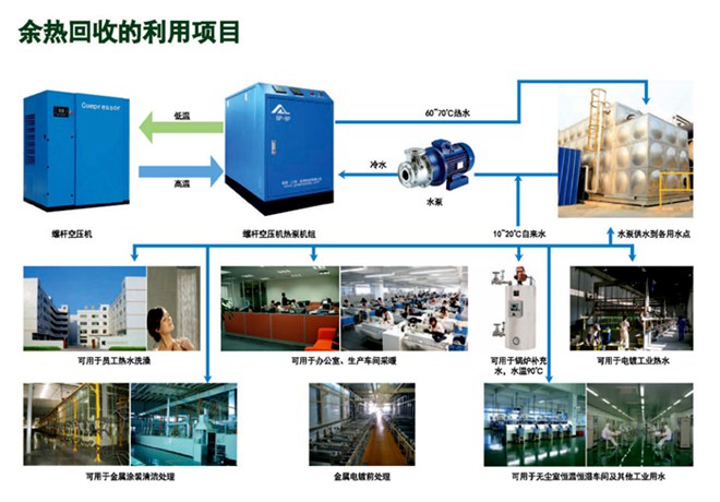空压机热能热水机组是一种利用压缩机高温油气热能,通过热交换将热能充分利用的节能设备。它通过能量交换和节能控制,收集空压机运行过程中产生的热能,同时改善空压机的运行工况,是一种相对高效废热利用、零成本运行的节能设备。
