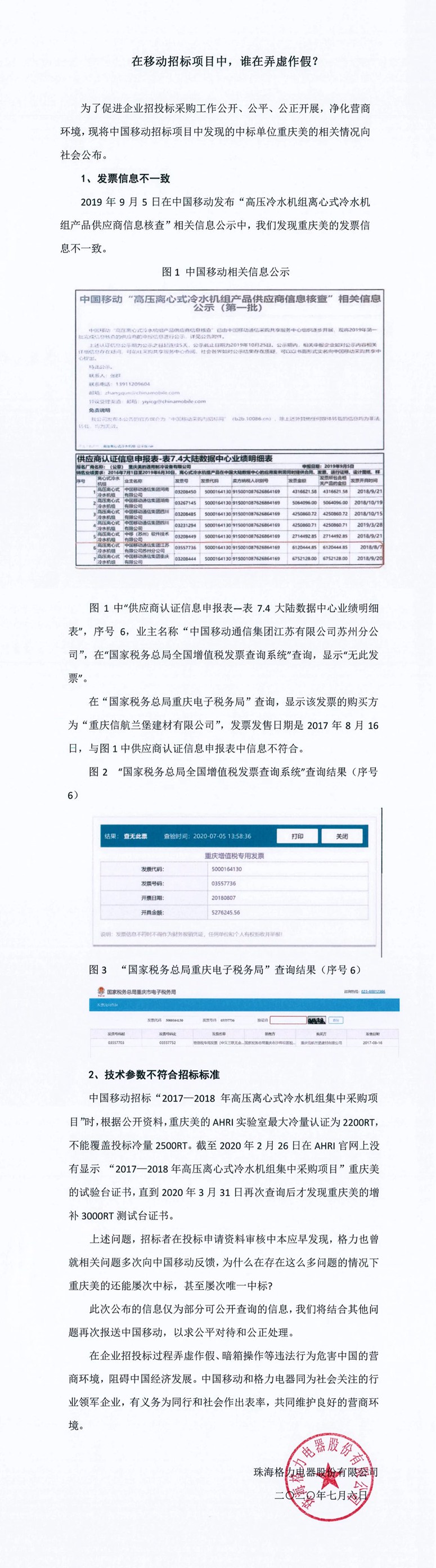 今天,格力官方发布文章《在移动招标项目中,谁在弄虚作假》实名举报美的在招标中弄虚作假。文章称美的的标书1、发票信息不一致。2、技术参数不符合招标标准。格力称,作为社会关注的行业领军企业,有义务为同行和社会作出表率,共同维护良好的营商环境。