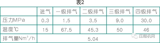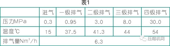 我公司研究制造的GOW-6/3-300型全无油润滑高压氧气压缩机,具体工况:压缩介质是高纯度氧气,气源压力即压缩机的进气压力0.3MPa,排气压力30.0MPa,标准状态下每小时的排气量为6立方米,采用风冷四级单作用压缩。