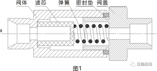 该机器是高压氧气压缩机,为了确保机器正常运转,每级都设有过滤器,过滤器型号是SS-6GL-10M,过滤器结构如图1所示,过滤器体为不锈钢,滤芯是烧结不锈钢,过滤精度是90μm,在全无油润滑15MPa高压充瓶氧气压缩机使用中也有使用,曾出现过因过滤器堵塞而致压缩机不能正常工作的情况。气阀正常,推测是过滤器堵塞所致。于是拆检过滤器。