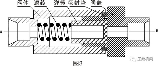 过滤器正常工作时,气流从A端进入,B端流出,若按图1所示安装滤芯,则滤芯圆柱面与底面均可过流,过流面积接近整个滤芯表面积,所以图1是正确安装;若按图3所示安装滤芯,则滤芯的圆柱面失去过流能力,只有端面与阀座中心园孔相同的面积表面起过流作用,灰尘等固态颗粒物在很小的平面上堆积,气流通道很快就会被堵塞。