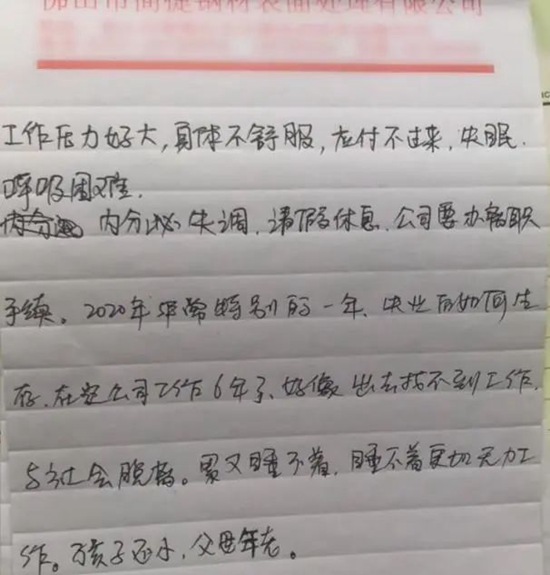 死者留下了一张纸条,写到:自己工作压力好大,身体不舒服想请假休息,公司要办离职手续。在这里工作6年了,与社会脱轨,今年又是特殊的一年,如果失业更找不到工作。每天失眠睡不好,更加无力工作。孩子还小,父母年老。