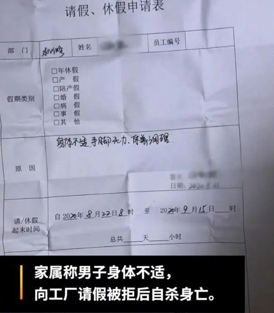 近日,广东一男子身体不舒服向工厂请假,工厂拒绝了请假的诉求,自杀身亡,警方已介入调查。