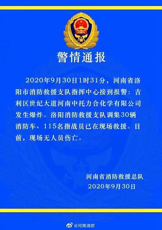 9月30日1时31分,河南省洛阳市消防救援支队指挥中心接到报警:吉利区世纪大道河南中托力合化学有限公司发生爆炸。洛阳消防救援支队调集30辆消防车、115名指战员已在现场救援。目前,现场无人员伤亡。