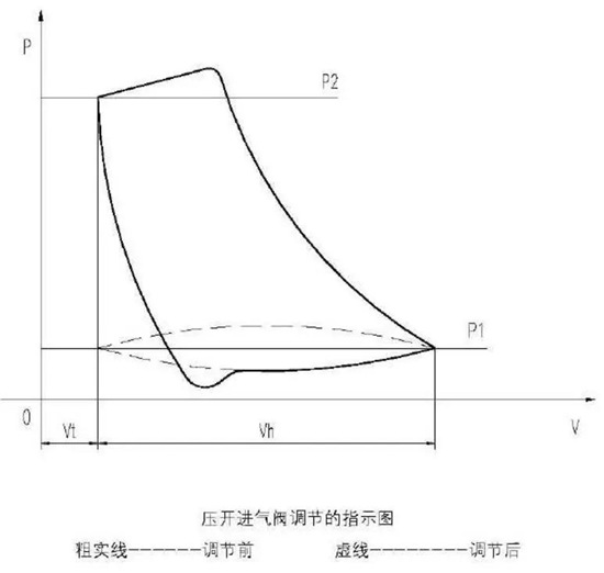 由于卸荷阀是运动件,总体调节可靠性有所降低。对于无润滑压缩机,要特别考虑卸荷器内运动件必须是无油润滑,特别是一些易燃易爆气体介质的特种压缩机。总的来说采用卸荷器调节排气量,其指示功为克服全开进气阀阻力所消耗的功,所以经济性较高。利用卸荷器压开进气阀调节的指示图如下: