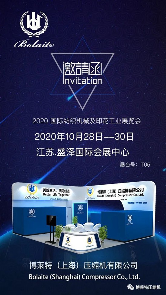 博莱特携全新3bar和5bar低压空气压缩机参加中国(盛泽)国际纺织机械及印花工业展览会!诚邀莅临!