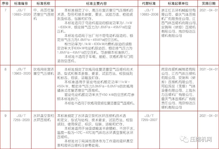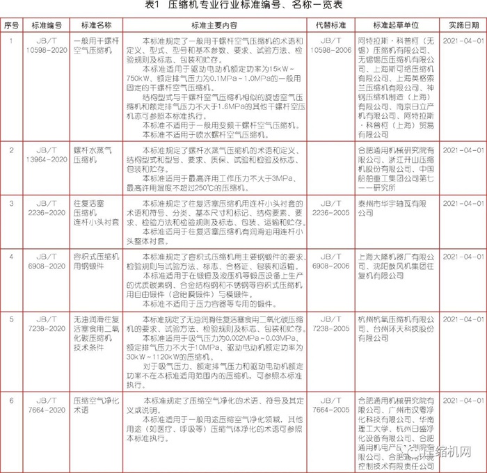 日前,工信部发布了2020年第37号中华人民共和国工业和信息化部公告,由公告批准发布了8项压缩机专业行业标准,实施日期为2021年4月1日。截至9月15日,2020年由压标委归口制修订的行业标准共发布8项。具体标准名称、标准编号及标准起草单位如表1。