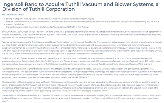 "我们很高兴欢迎泰悉尔真空和鼓风机业务团队加入英格索兰公司的大家庭。这项交易实现了我们大幅加快增长计划的承诺,并证明了我们寻找具有强大互补技术和商业增长机会的优质标志性工业品牌的能力,"英格索兰首席执行官Vicente Reynal表示。"按照公司严谨的资本配置策略,我们支付的倍数与之前的收购基本一致,并预计此次交易将在未来几年提供类似的机会,以产生投资回报率并降低收购后的倍数。总之,我们对此次收购有望为我们的股东创造短期和长期价值而感到自豪。"