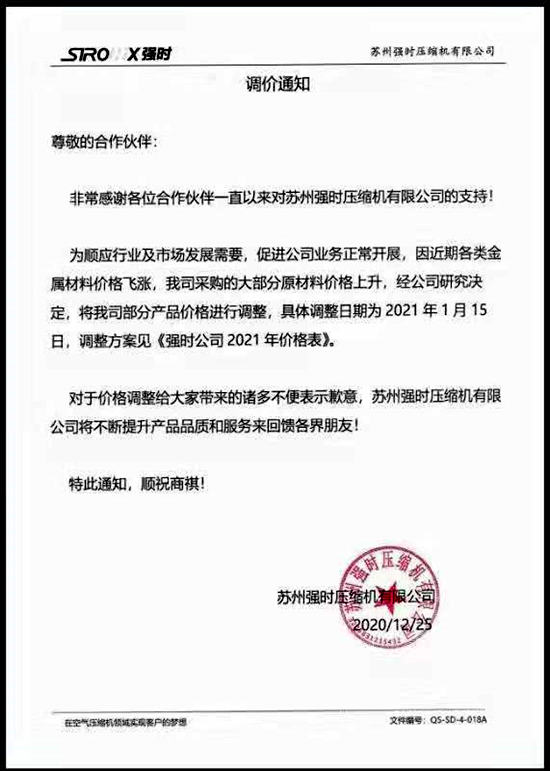 以下为苏州强时压缩机公司调价通知: