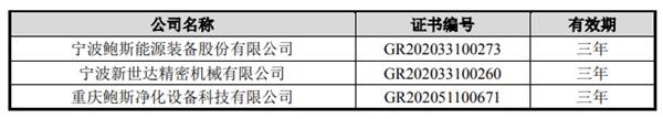 根据高新技术企业认定管理工作网发布的《关于宁波市 2020 年第一批高新 技术企业备案的复函》(国科火字【2020】245 号)和《关于重庆市 2020 年第 一批高新技术企业备案的复函》(国科火字【2020】226 号),宁波鲍斯能源装备股份有限公司、公司全资子公司宁波新世达精密机械有限公司、公司控股子公司重庆鲍斯净化设备科技有限公司均重新通过高新技术企业认定。