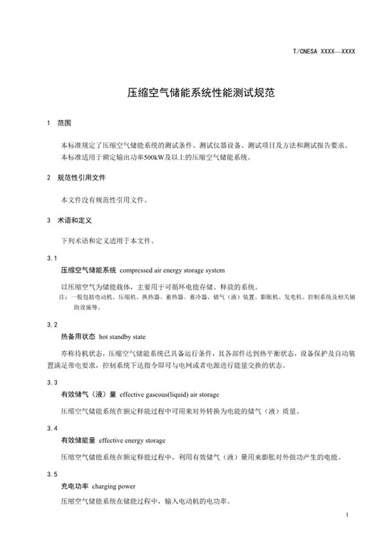 该标准规定了压缩空气储能系统的测试条件、测试仪器设备、测试项目及方法和测试报告要求。本标准适用于额定输出功率500kW及以上的压缩空气储能系统。