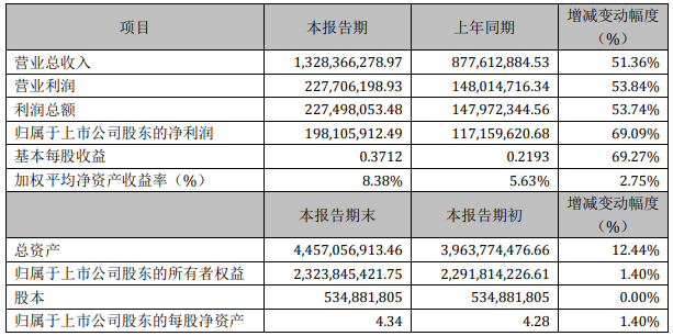 公司在2021年7月14日披露的《2021年半年度业绩预告》,预计2021年半年度归属于上市公司股东的净利润变动幅度为增长65.00%~75.00%,金额变动区间为19,331.33 万元~20,502.93万元。本次业绩快报披露的2021年半年度归属于上市公司股东的净利润19,810.59万元,同比增长69.09%,在前次披露的业绩预告范围内。