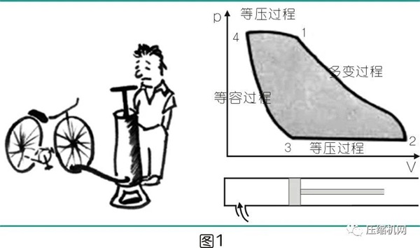 我们通常使用P-V图来描述空气压缩机工作过程。如果我们有日常生活用打气筒给自行车轮充气经历,就很容易理解空气的压缩有四个过程:等容过程(容积不变)、等压过程(压力不变)、多变过程(容积、压力、温度变化),(见图1)。