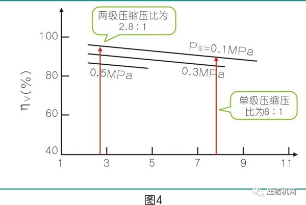 同样排气压力为7bar,单级压缩主机压比为8:1;两级压缩主机头压比为2.8:1。从容积效率来看,压比增大,绝热效率值下降。(见图4)