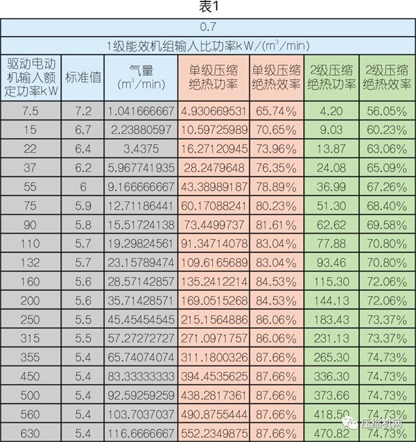本文主要从喷油螺杆空压机对1级能效限定值的绝热效率需求值去分析主机对空压机节能的影响,并运用绝热效率来揭示单级压缩和两级压缩节能的秘密。