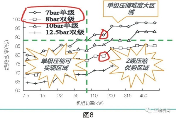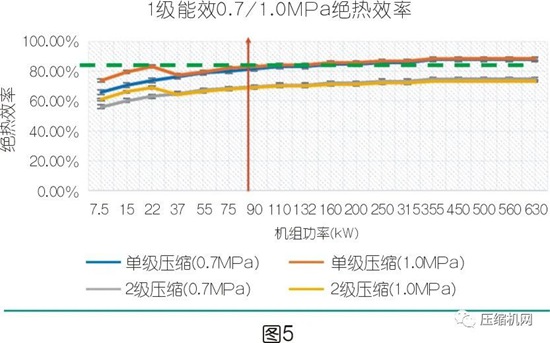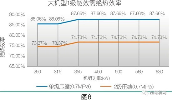 在现有的技术和制造水平,相同排气压力及机组功率下,由于两级压缩主机在压缩比﹑二级进气温度(大多数两级压缩主机通过中间喷油冷却,使得二级进气温度=1级排气温度-8℃)、容积效率比单级压缩更优,绝热效率需求值降低10%左右是不难的事情,从而更容易达到1级能效限定值。