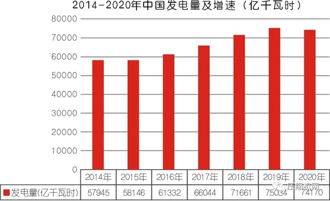 作为工业企业能耗大的设备,空压机房节能改造大有可为。在我国,空压机每年用电量约占社会总发电量的9%,以2020年发电量计算:74170×9%=6675亿千瓦时(度)。
