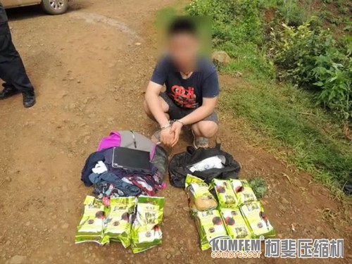 ↑抓获的女子和查获的空气压缩机,民警查获14包共5.18公斤冰毒