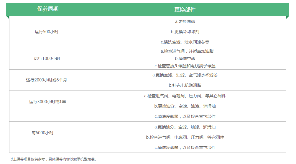 当然了,空压机维修保养的内容还有很多,比如补充电机润滑脂、检查进气阀、电池阀、压力阀、清洗冷却器、检查管接头螺丝和电线端子螺丝等。如果您有任何空压机保养上的问题都可以直接现在咨询我们,最后为大家附上小编整理的空压机保养周期表:(内容仅供参考)